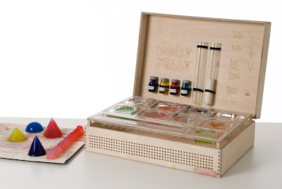O mais interessante é que, estudantes do Ensci - Les Ateliers de Paris, os designers francêses Raphael Pluvinage e Marianne Cauvard criaram um kit (um protótipo totalmente funcional feito com arduino e max/msp onde o video não teve seu som editado) com um pequeno laboratório de química sonoro, proporcionando a experiência a qualquer um, como um jogo... onde o jogador pode criar sua própria gelatina com água e alguns gramas de pó de ágar-ágar (uma substância derivada algas marinhas) adicionando cores diferentes a mistura dentro dos moldes fornecidos.